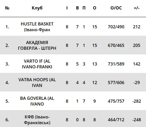 Дивізіон Перший. У Першому дивізіоні беззаперечним лідером виступає «Hustle Basket» (Івано-Франківськ) з 7 перемогами у 8 матчах, демонструючи високі результати вдома та на виїзді. Напружену боротьбу за друге місце ведуть «Академія Говерла — Штерн» та «Varto IF», які також демонструють атакувальну гру та яскраві індивідуальні виступи.
