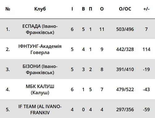 Дивізіон Вищий. Лідером цього сезону є «Еспада» (Івано-Франківськ) з 5 перемогами у 6 іграх. Команда показує стабільну гру вдома та на виїзді, а її гравці демонструють високі показники середньої результативності та ефективності. Друге місце утримує «ІФНТУНГ — Академія Говерла», яка відзначається потужною атакою та яскравими індивідуальними виступами. Слід зазначити, що МБК «Калуш» поки що бореться за кожну перемогу, а «IF Team» ще не здобула жодної звитяги у цьому дивізіоні.