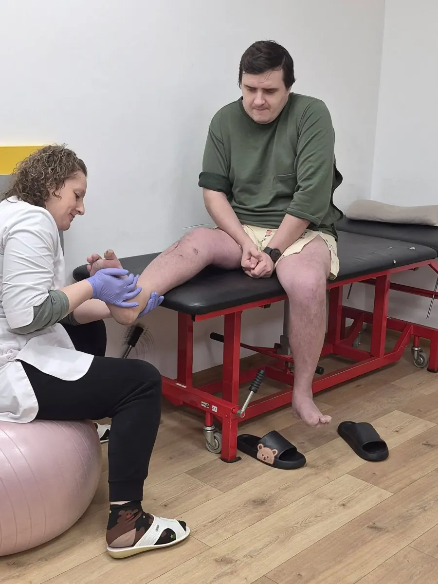 «Я ерготерапевтка, але виконуватиму роботу фізичного терапевта, — пояснює пані Леся. — Будемо робити мобілізацію колінного і гомілковостопного суглобів, є після травми закладені пластини — потрібно привести ногу до роботи. Він хоче дуже ходити — і вже виходить. Ми йому допомагаємо: його бажання, його труд, а ми — як підтримка і допомога».