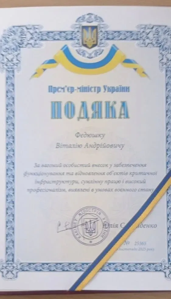 За сумлінну працю, відповідальність та професіоналізм, виявлені в умовах воєнного стану, Віталія Федюшка нагороджено Подякою прем'єр-міністра України Юлії Свириденко.