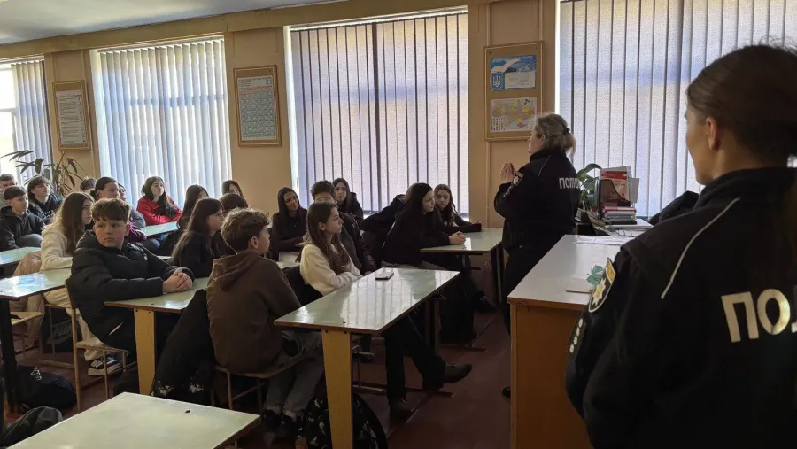 - Укриття: Знайдіть безпечне місце подалі від вікон, дверей та в полі зору (наприклад, за партами у кутку), ляжте на підлогу.