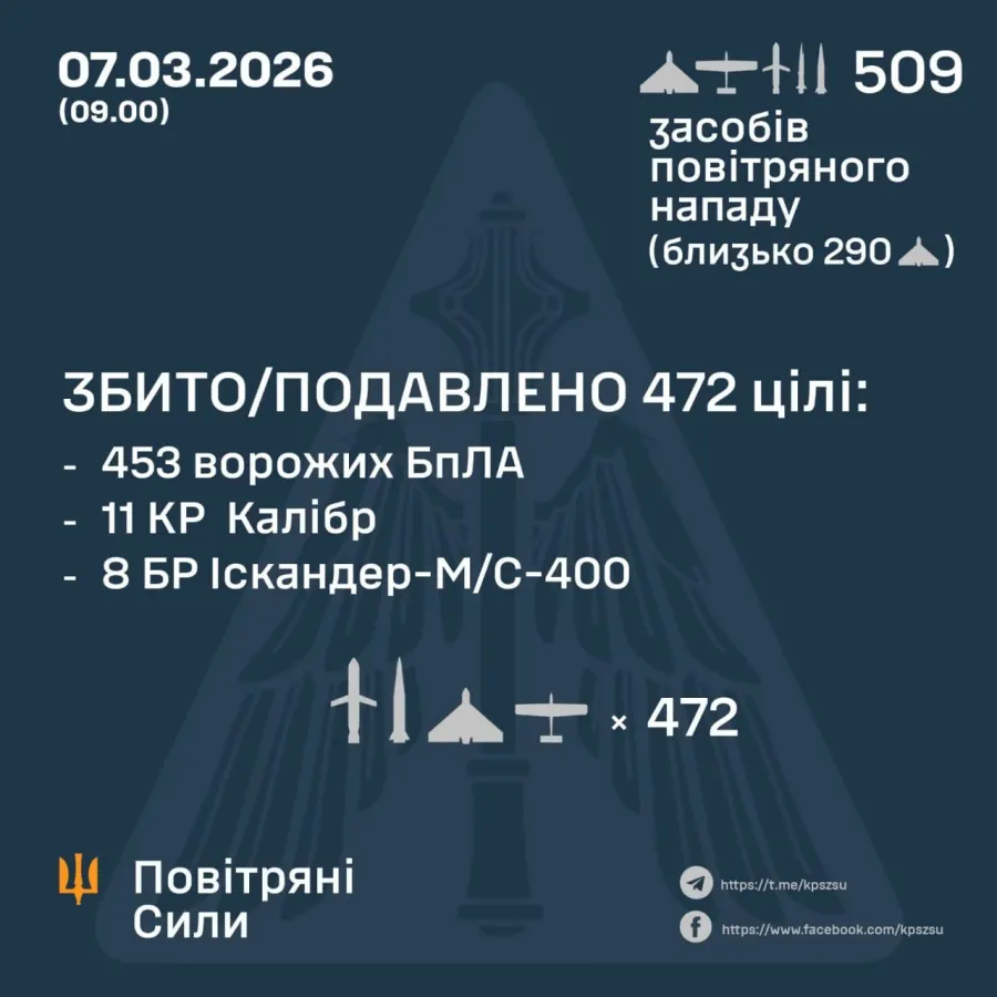 У ніч на 07 березня (з 18:00 06 березня) противник завдав комбінованого удару по об'єктах критичної інфраструктури України із застосуванням ударних БпЛА, ракет наземного та морського базування. Усього радіотехнічними військами Повітряних Сил зафіксовано 509 засобів повітряного нападу: