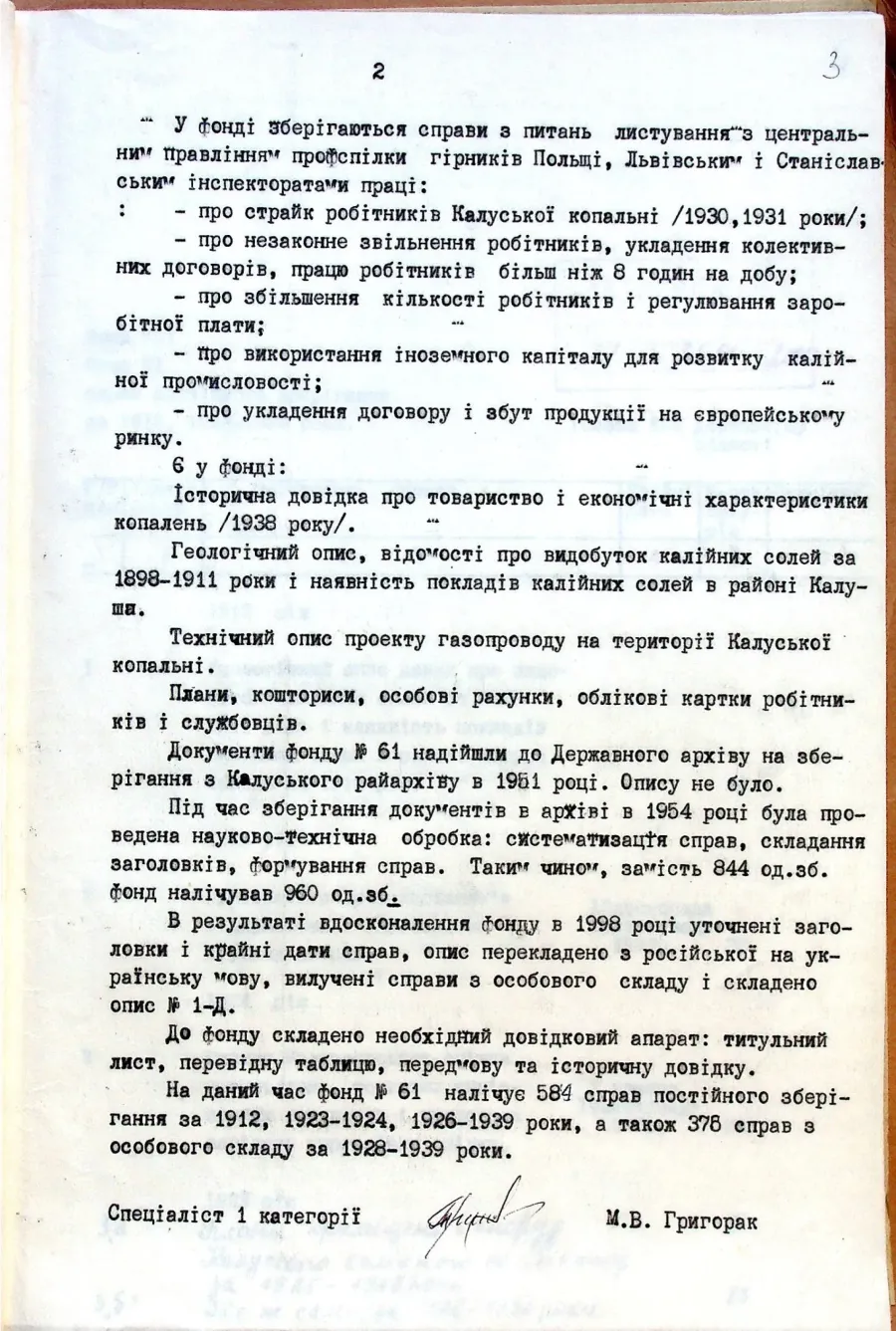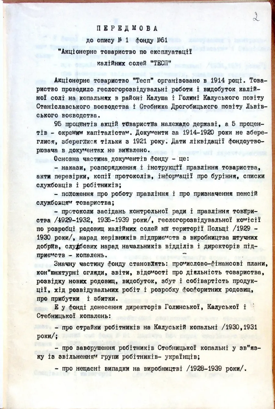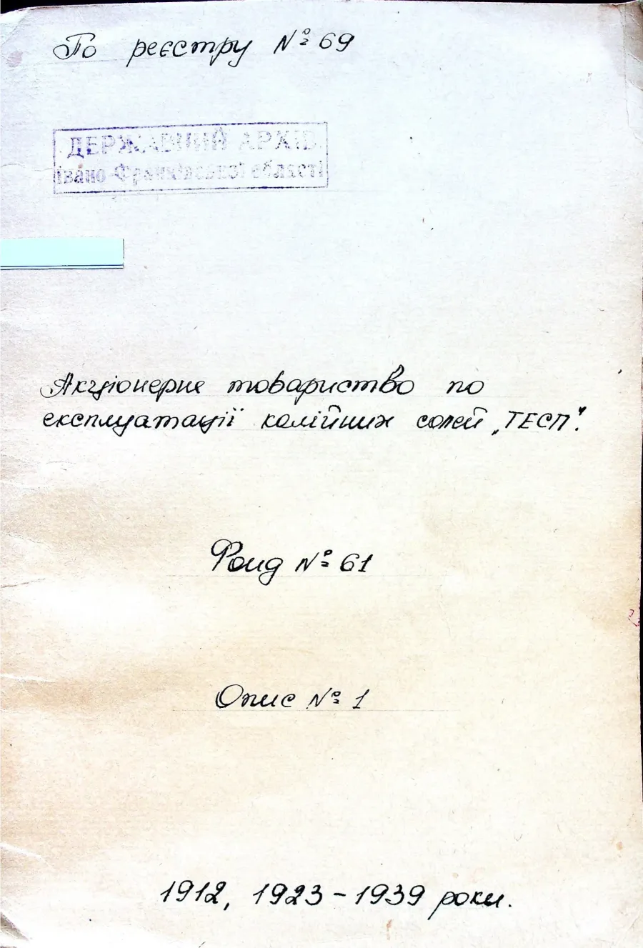 Наступна інформація про той архів є в Державному архіві Івано-Франківської області (ДАІФО). Передмова до опису №1 фонду №61 «Акціонерне товариство по експлуатації калійних солей «ТЕСП» серед іншого інформує, що документи фонду №61 надійшли на зберігання до Державного архіву з Калуського райархіву в 1951 році. Опису не було. Документи за 1914-1920 роки не збереглись — тільки з 1921 року. Дати ліквідації фондоутворювача не виявлено. В 1954 році була проведена науково-технічна обробка — систематизація справ, складання заголовків, формування справ.