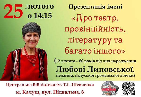 З нагоди 60-річчя педагога, калуської громадської діячки Любові Липовської у центральній міській бібліотеці Калуша відбудеться творча зустріч.