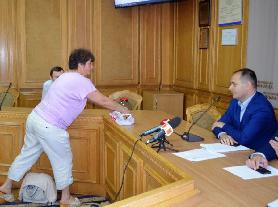 Мешканці будинку вирішили порозмовляти із міським головою. Як аргумент принесли Руслану Марцінківу подарунок – 3-літрову банку із сумішшю, якою заповнений їхній підвал: