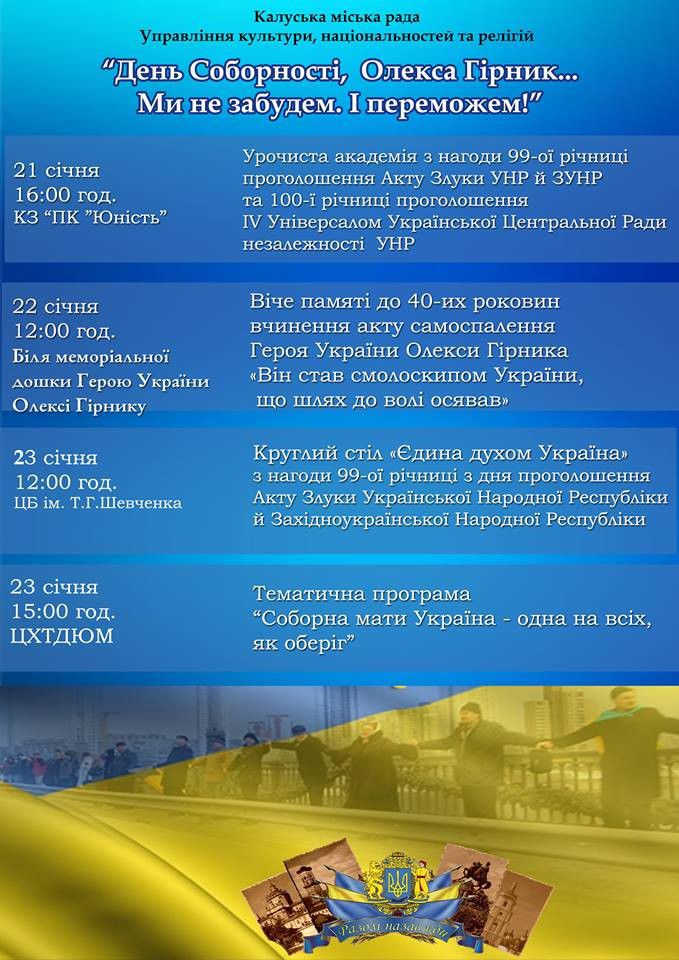 У Калуші 21 січня о 16 годині у палаці культури "Юність" відбудеться урочиста академія з нагоди 99-ої річниці проголошення Акту Злуки УНР й ЗУНР та 100-ої річниці проголошення IV Універсалом Української Центральної Ради незалежності УНР, інформують "Вікна" з посиланням на прес-службу Калуської Міської ради.