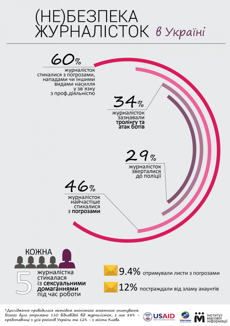 За результатами анкетування, 60% журналісток, які працюють в Україні, стикалися з погрозами, нападами, чи іншим фізичним насиллям у зв'язку зі своєю професійною діяльністю. З них, тільки 29% журналісток зверталися за захистом до правоохоронних органів.