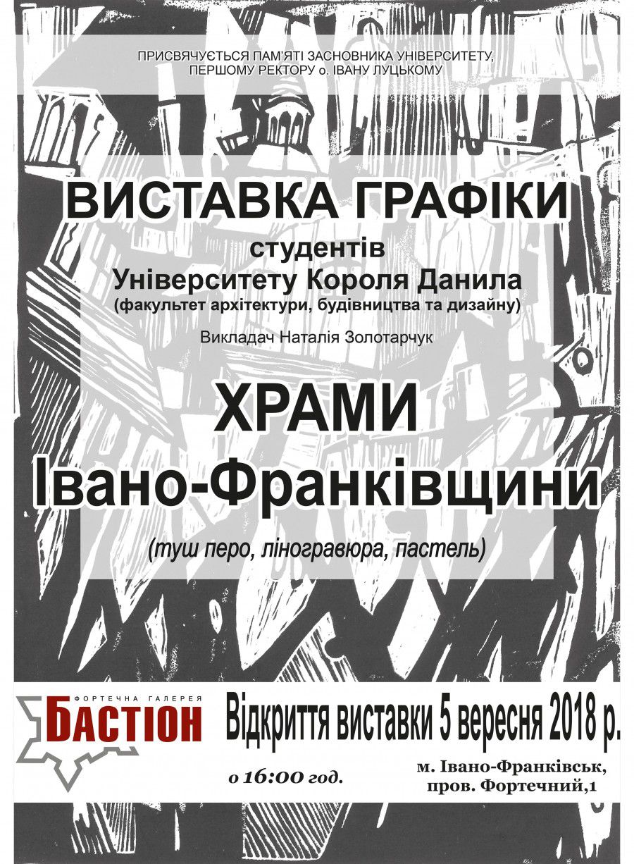 Експозиція, на якій презентують мистецький доробок студенти кафедри архітектури та дизайну, присвячена пам’яті засновника Університету та його першому Ректору – доктору юридичних наук, професору, академіку, доктору права, доктору філософії, доктору канонічного права, Відміннику освіти України, адвокату, Митрофорному протопресвітеру, отцю Івану Луцькому, інформують "Вікна".