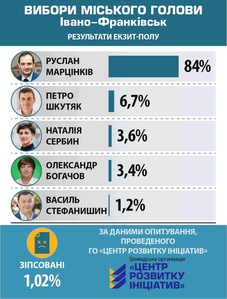 За даними опитування, проведеного ГО "Центр розвитку ініціатив", перемагає Руслан Марцінків, який набирає 84% голосів.