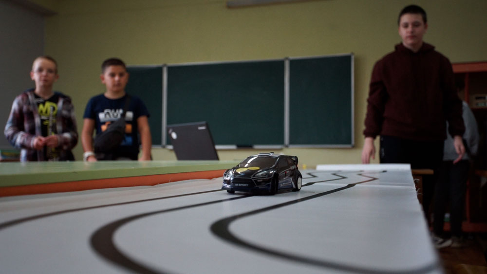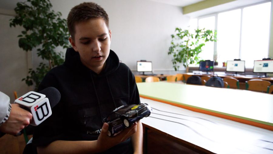 «Машинка повнопривідна з поворотами коліс, має 6 датчиків, заряджається на батарейках, розроблена у спеціальному додатку», — розповідає про винахід хлопець.