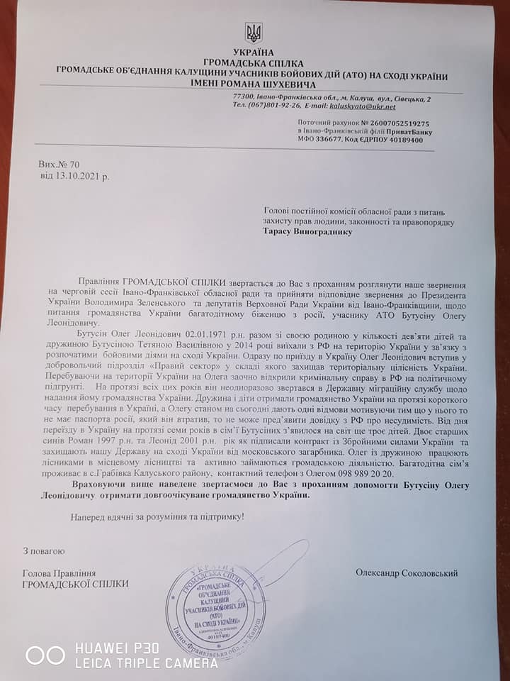 2 серпня 2019 року, під час візиту на Калущину президента України, російський біженець, батько 12-ти дітей, доброволець «Правого сектору» Олег Бутусін та його дружина Тетяна змогли передати своє звернення щодо надання Олегові громадянства України Володимиру Зеленському.