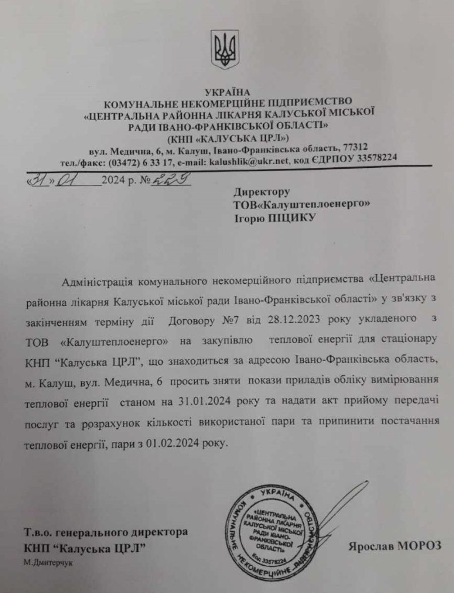 Однак медзаклад вже продемонстрував твердий намір змінити постачальника теплової енергії. 31 січня адміністрація Калуської ЦРЛ направила листа ТОВ «Калуштеплоенерего», у якому у зв’язку із закінченням терміну дії договору просить зняти покази приладів обліку теплової енергії на 31.01.2024 року, а також «припинити постачання теплової енергії, пари з 01.02.2024 року».