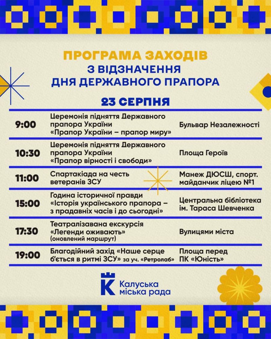 До Дня Державного прапора України в п'ятницю, 23 серпня, у Калуській громаді відбудеться низка заходів: